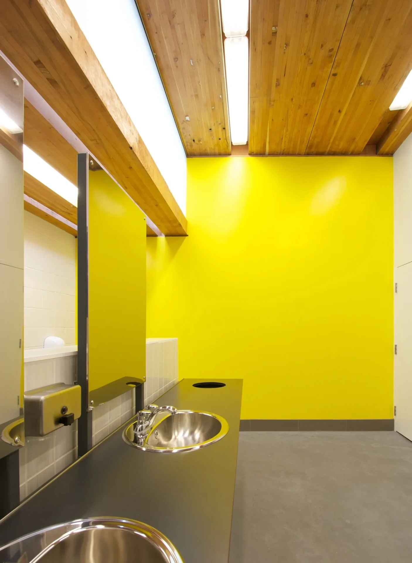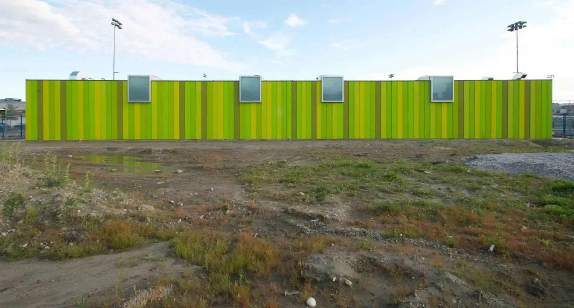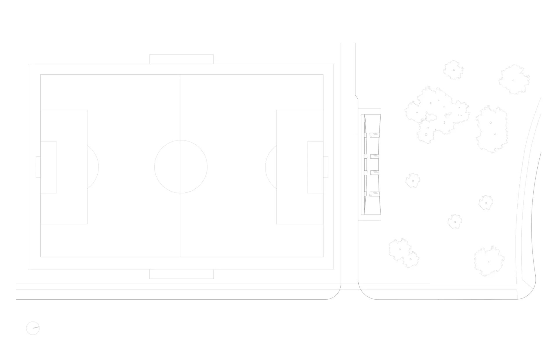 The Trillium Park Fieldhouse in Vancouver provides infrastructure support to two artificial turf sports fields to its south and a small passive park to its north. At 1,700 square feet, the building contains washroom, change room and shower facilities as well as a small staff room. Acting as a wall in the open landscape, the long narrow building divides the site into two types of outdoor spaces—active sports field and leisure green space. Within the vast, flat industrial context, the field house offers a degree of definition, containment and separation between the active and passive parks. In response, the building form deflects subtly on its two long faces, becoming concave on both the north and south sides under the implied force of the adjacent uses.